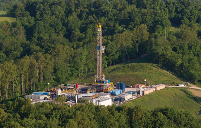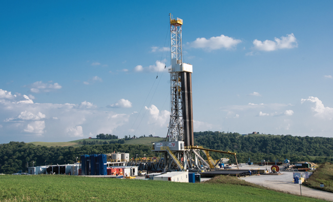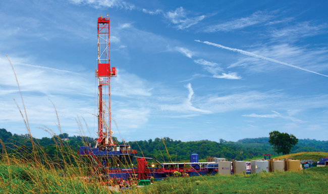 A Southwestern Energy rig is shown here drilling in the northern West Virginia Panhandle, where the company has Marcellus, Utica and Upper Devonian targets, thanks to a 2015 acquisition. Southwestern says its first Utica well was flowing at 17 million cubic feet a day in April, and has an estimated ultimate recovery of 2.5 billion-3.0 billion cubic feet per 1,000 feet of lateral.