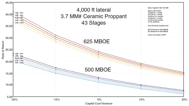 A 10 percent increase in ROR is impressive, but the biggest gains come from boosting EURs. Bump the well’s EUR to 625 million boe and the ROR will jump from 13 to 25 percent. Combine that with 10 percent decreases in capital costs and LOEs, and the ROR will exceed 30 percent.