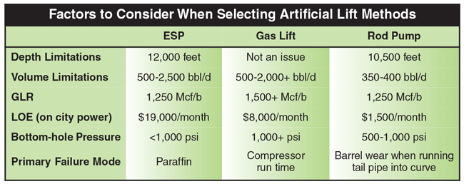The right application is key. In deeper wells, those with high gas-to-oil ratios, or those with strong bottom-hole pressures, gas lift can make more money even when city power becomes available. As shown in Table 1, our experience suggests ESPs are best reserved for wells with low GORs.