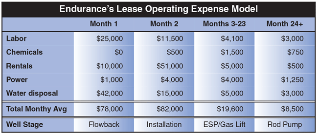 Endurance’s LOE model breaks a well’s life into four stages. In the first month, when the water from the completion and the flush production are flowing in, total costs average $78,000 (Table 2). In the second month, water disposal costs and labor costs drop, but artificial lift equipment has to be rented and installed, bringing the average cost to $82,000.
