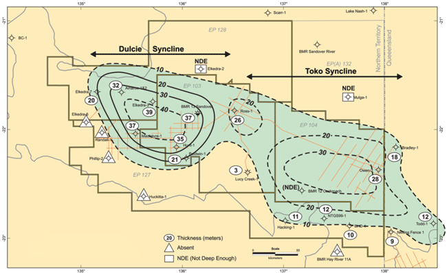 He explains that the target formation is the Lower Arthur Creek “Hot Shale” (Figure 1), which is a middle Cambrian source rock. It is analogous to the Bakken in most places, Bennett says, but more like the Eagle Ford with carbonates and high organic content in others. A November 2010 Ryder Scott evaluation estimates the shale contains 26 billion barrels of oil in place in the shale, plus another 1 billion barrels in conventional carbonates (P50 recoverable).
