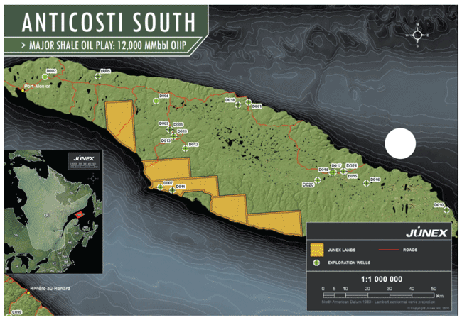Junex holds 233,275 gross acres in the Macasty Shale play on Anticosti Island in the Gulf of St. Lawrence off the Gaspe Peninsula in Quebec. The Ordovician Macasty Shale is a corollary to the Utica Shale, and is estimated to contain 12.2 billion barrels of oil in place across Junex’s lease position.