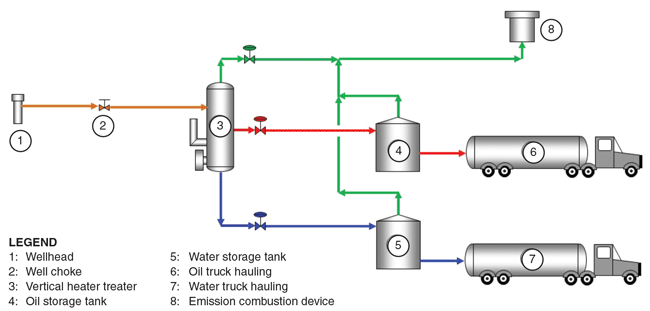 In a conventional oil field with vertical wells, oil typically is produced through a manual choke into a low-pressure heater-treater (a vertical or horizontal three-phase separator with a maximum pressure of 75-125 psig). Oil and water are directed to tanks vented to the atmosphere, while the resulting flash gas is sent to a gathering system, vented or flared (Figure 1A).