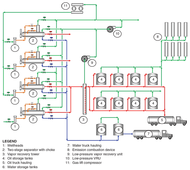 Produced oil from the separators carries flash gas, and the large volumes of oil produced from multiple horizontal wells on a single pad push the limits of allowable volatile organic compound emissions. The lowest-cost design option is to flash the oil to the storage tanks, then recover the vapors with a VRU compressor.
