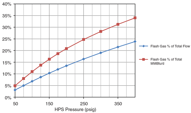 Figure 2 shows the volume of flash gas increasing with increasing HPS pressure, with total Btu production increasing even faster. At an HPS pressure of 75 psig, the flash gas is about 5 percent of the volume and 8 percent of the Btu value. At 250 psig HPS pressure, this triples to 16 percent and 25 percent, respectively. The value of the flash gases at these higher HPS pressures can add $2.50-$3.00/bbl of oil to total well revenue.
