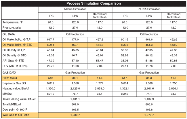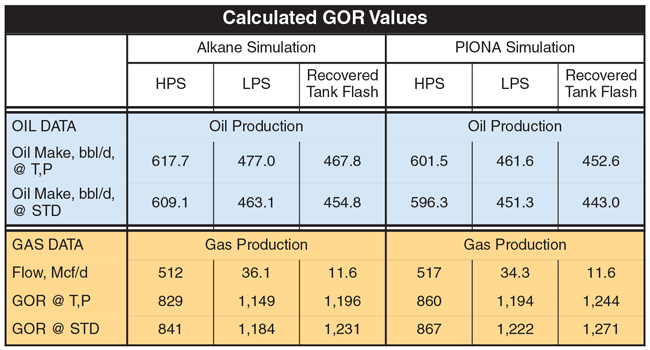 In many cases, GOR is based on oil measurement either at the primary separator, or at the tankage using production numbers for the well. Gas measurement typically is taken at the primary separator conditions, and only rarely is adjusted for vapor recovery, preventing closure of facility material balances. Table 2 compares the GOR values from alkane and PIONA simulations of a typical shale oil well using the same data as in Table 1.