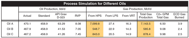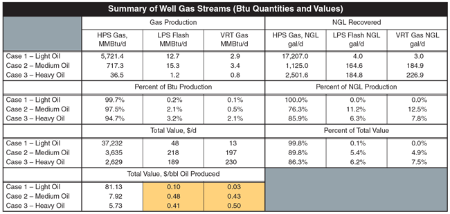 Table 3 shows the simulation results calculated on a single-well basis (values for larger multiwell pads are an arithmetic multiple of these values times the number of wells feeding a facility). The wide range (about 1,200 percent) in HPS production highlights the differences in GOR. In contrast, LPS gas volumes from oil production vary by only 25 percent. The design for flash gas handling equipment is obviously strongly dependent on total oil production and significantly less dependent on GOR. This allows facilities engineers to simplify the design of gas handling facilities, sizing equipment based on predicted oil production rates.