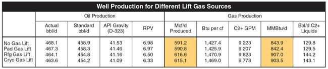 As shown in Table 5, dew pointing the lift gas actually increases the total gas and liquids delivered to downstream processing plants. This is because of the nature of the lift gas system. The “dry” lift gas mixes with the produced oil and gas from the well, effectively stripping some of the lighter ends from the oil. This helps slightly stabilize the oil and reduce its API gravity. In this example, using processed lift gas increases total MMBtu production by 7 percent and total ethane-plus liquids by 10 percent while reducing the total oil volume by only 1 percent.