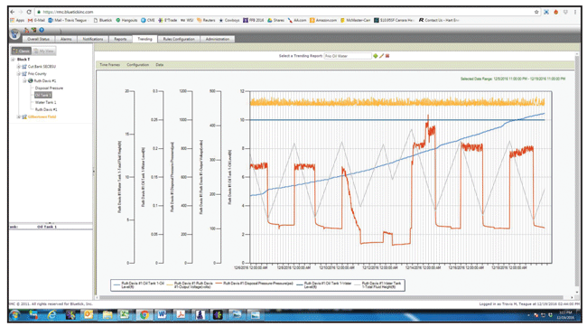 Remote monitoring and real-time data analysis are giving Rock Creek Oil LLC new operational insights and the ability to optimize production and quickly identify potential issues. Shown here is a screen shot of a trending report for one of the company’s leases using Bluetick Software’s remote monitoring and control solution.