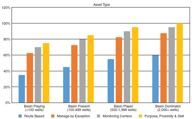 Large operations with well-developed, dense fields and larger economies of scale will gain more from automation than smaller operations. Only the largest companies will unlock automation’s full potential, and even they must use purpose, proximity and skill to do so. However, even much smaller companies can gain most of automation’s benefits as long as they manage their wells by exception, and they, too, unlock more by progressing to purpose, proximity, and skill (Figure 1).