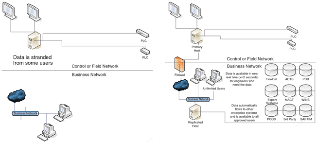 In the traditional approach to automation (left), data are held in separate systems or “islands of automation.” As a result, employees spend considerable time exchanging, translating and verifying data. In contrast, the enterprise automation approach (right) makes data available to all authorized users simultaneously and automatically exports data to key software programs. This enables employees to concentrate on analyzing data, making informed decisions, and increasing production.