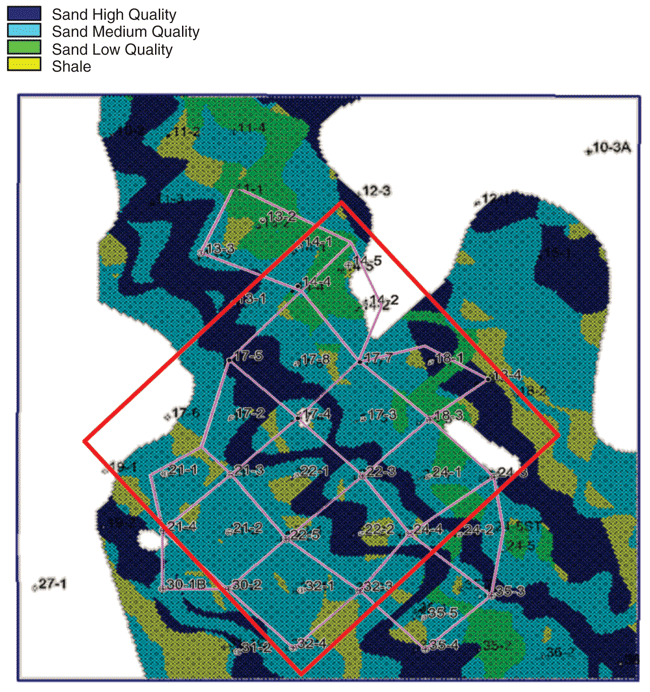 - Intermediate porosity/permeability zones that indicate areas of intermediate-quality reservoir;