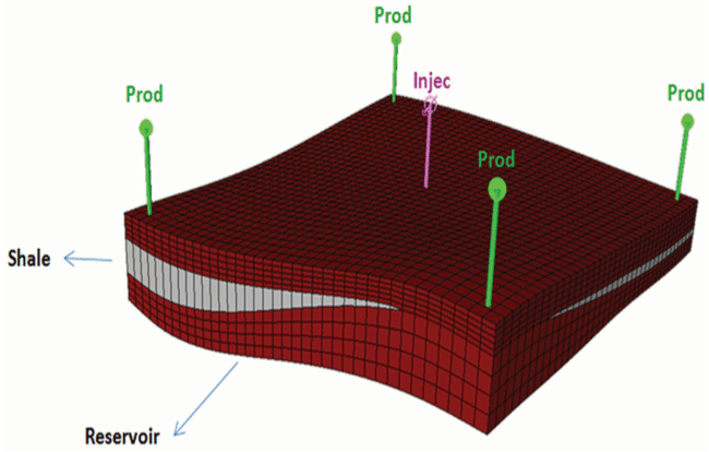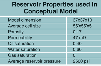 To develop an understanding of the effect of various reservoir dynamic parameters on seismic response, a conceptual model study was performed and several simulation scenarios were tested. The model was built with an injection/production pattern (Figure 2) from the Postle reservoir model using the rock physics model. Table 3 shows the average Postle reservoir properties used in the model. The average injection rates, production rates and operational constraints also were honored.
