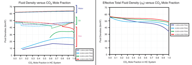 The plot on the left side of Figure 3 displays variations in water, oil and gas densities with respect to CO2 mole fraction in overall oil composition (ZCO2) for different pressure ranges. The right side plot shows the effective total fluid density weighted by saturation, for different pressure ranges.