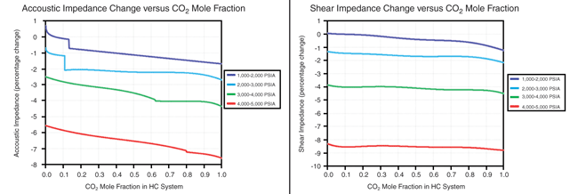 The study also demonstrates that SI is impacted mainly by pressure changes, with a +2,500 psi change resulting in a -6 percent change in SI. The fluid saturation effect is very small in SI. Sensitivity analysis also indicates that CO2 compositional effects on oil are very complex and depend on CO2 concentration and pressure. The evolution of the secondary liquid phase in the reservoir significantly affects the density and compressibility of the fluid system, and is noted by an abrupt shift in AI.