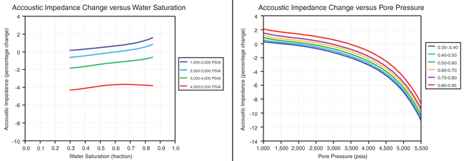 A final case simulated increased pore pressure on seismic attributes. The average reservoir pressure was increased by 2,500 psi by water injection. The time-lapse results show that an increase in pressure affects both AI and SI (AI is reduced 3.5 percent and SI is reduced 6.0 percent).