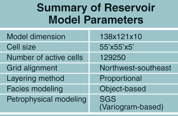 An object-based model was used to spatially distribute the four log facies in the reservoir model. Table 1 is a summary of static reservoir model parameters, while Figure 1 displays a map view of the reservoir model showing the log facies distribution, the survey area (blue box) and simulation study area (red box). Whiting’s CO2 flood patterns are overlaid on the map. A section of the RCP survey area was selected for the simulation study because of the computational limitations and long simulation run time of a full-field model.