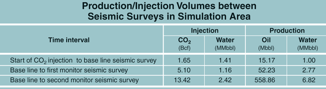 A substantial amount of CO2 and water were injected into the reservoir during the nine months between the base line and the first monitor survey. The second monitor survey was acquired 14 months after the first monitor survey while the reservoir was undergoing production and injection. The injection and production of CO2, water and oil cause saturation and pressure changes, which in turn, affect the acoustic properties of the reservoir. Table 2 shows the amount of production and injection of the different fluids between seismic surveys.