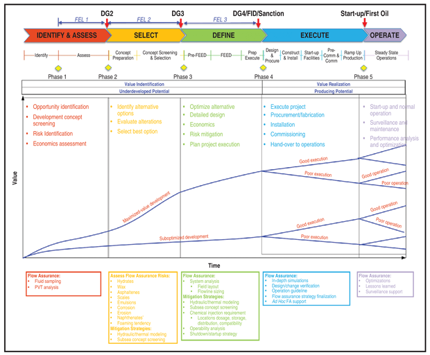 The early stage in a development project’s life cycle is the time when the ability to influence changes in design is relatively high and the cost to make those changes is relatively low. Figure 1 illustrates how flow assurance impacts concept selection, project execution and asset value. Develop sufficient strategic information and engineering analyses to address risks and guide decision making for concept screening exercises. Then the FEED can maximize the potential for success. Sufficient FEL is the key to any successful project, and early engagement of flow assurance is critical for field development and production system concept selection.