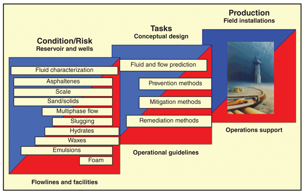 Figure 2 identifies many of the flow assurance issues that can plague field operations and project execution. Despite the large number of potential flow assurance risks, there are only three questions to be answered for a pantheon of problems that can impede flow over the life of a development project: