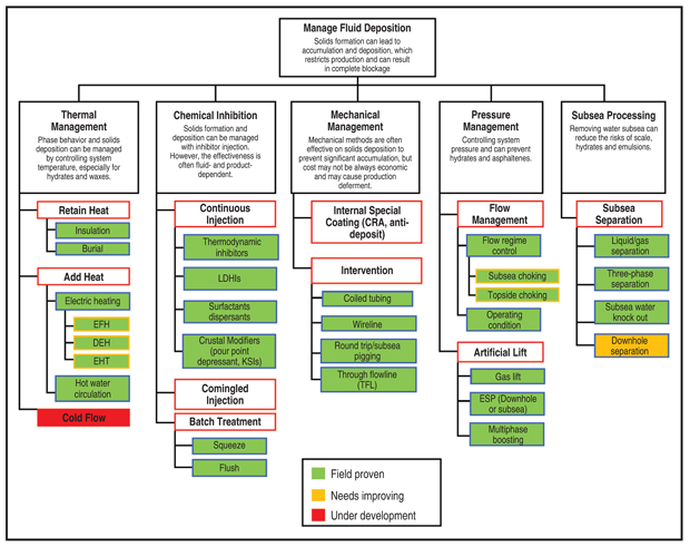 Figure 3 summarizes the state of technology to manage flow assurance risks, including preventing problems related to the deposition of hydrates, paraffin, scales and other solids.