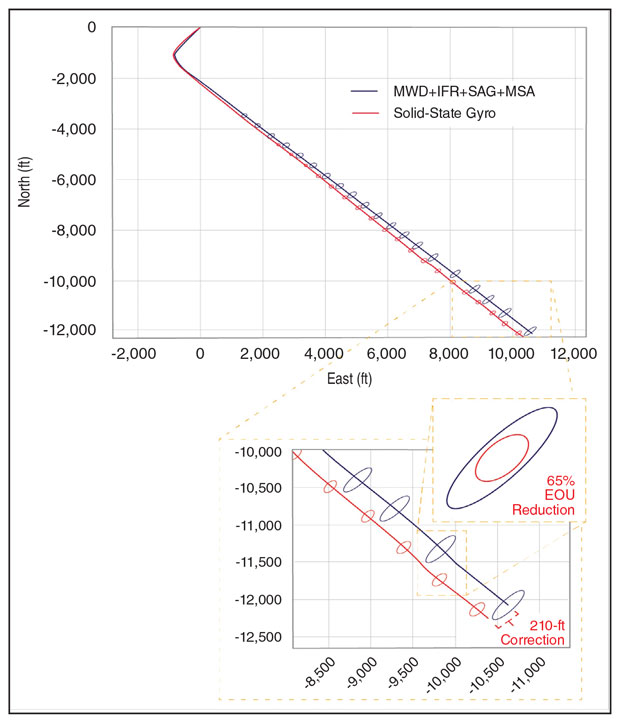 After running the gyro, improvements were made in several areas. First, the EOU was reduced by 65% versus conventional MWD surveys with IFR, BHA sag, and MSA corrections, dramatically improving survey accuracy and precision (Figure 1).