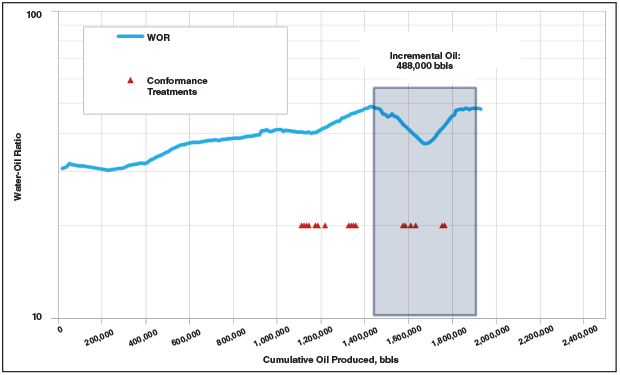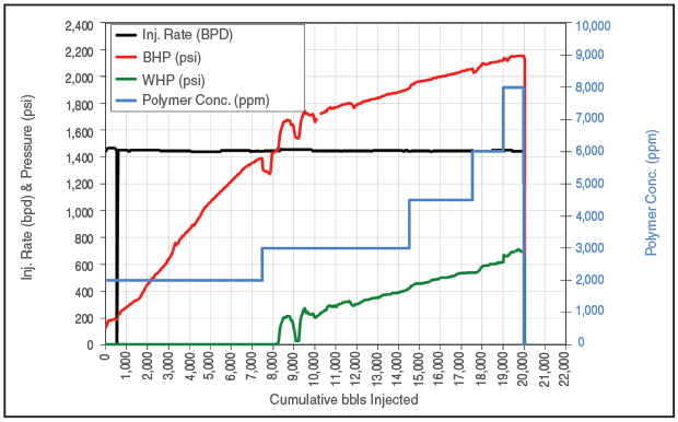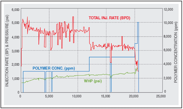 A polymer gel conformance treatment was recommended to address the communication and improve the oil recovery in this pattern. Use of high-molecular weight cross-linked polymer was specifically suggested to avoid penetration into the matrix with lower permeability. Roughly 20,000 barrels of high-molecular-weight polymer was injected in stages from 3,000 to 10,000 ppm at a 40-to-1 polymer-to-cross-linker ratio. The injectivity was reduced from 7.0 bb/d to 1.3 bbl/d per psi during the treatment (Figure 1).