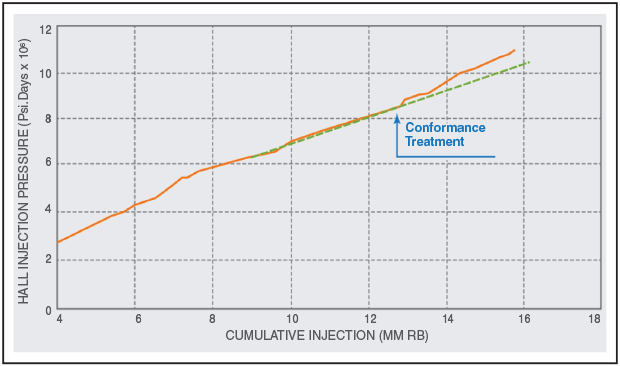 Conformance/profile modification targets inefficient flood patterns to improve oil production by redirecting injection fluid to lower-permeability or tighter unswept portions of the reservoir. Conformance treatments address high-permeability streaks known as thief zones by blocking these areas deep into the reservoir, forcing the injection fluid around the gel block into tighter, oil-saturated rock. This results in the mobilization of bypassed oil to offset production wells, often resulting in significantly increased reserve recovery. Profile modification treatments address injection profile inefficiencies by directing injection fluids more proportionally when multiple zones are open. In many cases, the majority of fluid favors one or two intervals. As a result, injection fluid is forced into neglected intervals to increase oil production.
