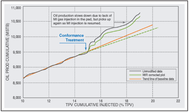 In summary, polymer gel conformance treatment resulted in total incremental oil of 460,000 barrels at an effective incremental rate of 630 bbl/d for the pattern. Incremental oil production had to be corrected for the time that injector I-1 was down until it returned to normal injection. A temporary decline in the trend of incremental oil production can be observed, which is due to a lack of miscible gas injection in the pad.