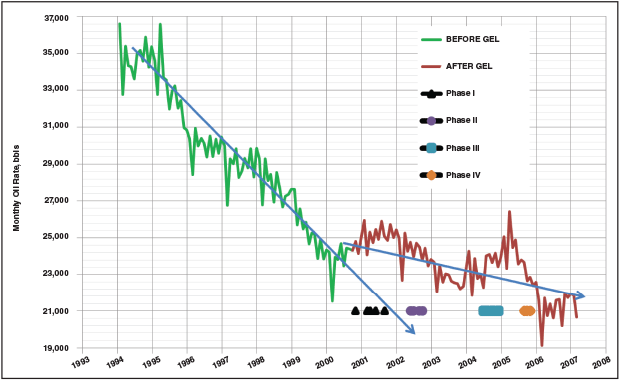 Figure 5 shows the monthly oil rate trend for all 38 offset producers in phases 1 through 4. Note the increase in oil production three months after the first treatment followed by continual oil rate increases and a significant change in the oil production decline throughout the four phases.