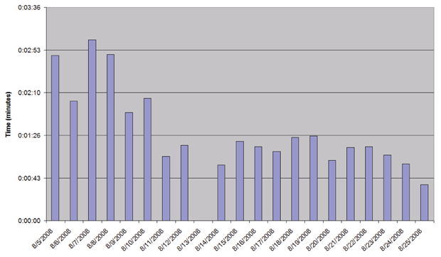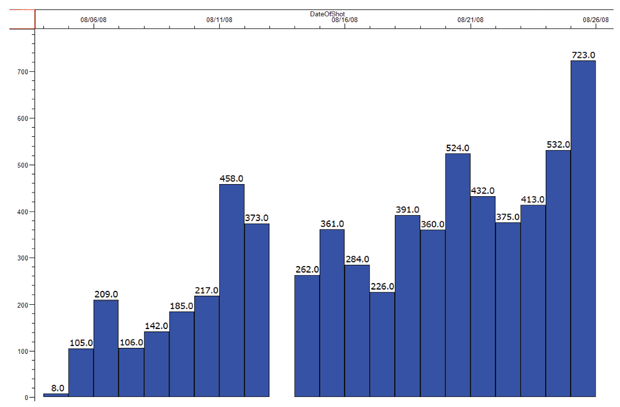 In 2009, only four years after initial field testing, the technology was deployed in seven cableless acquisition projects spanning from the Haynesville Shale in East Texas to Mexico and China. Figures 1 and 2 show sample learning curves using the cableless system in a 3-D acquisition project in August 2008. The number of shots recorded each day followed a marked upward trend as the project proceeded, while the time between shots trended in the opposite direction–underscoring the technology’s improved efficiencies as the crew’s experience and comfort levels increased.