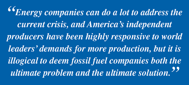 Energy companies can do a lot to address the current crisis, and America’s independent producers have been highly responsive to world leaders’ demands for more production, but it is illogical to deem fossil fuel companies both the ultimate problem and the ultimate solution.