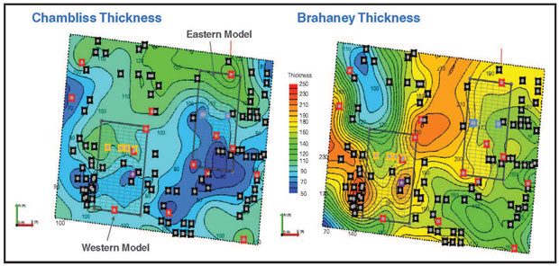 A total of 13 layers were defined for each model area, and the layers containing anhydrite were assumed to be “nonreservoir” units. Separating layers into reservoir and nonreservoir rocks enabled a deterministic approach to be used to map reservoir properties and build the 3-D reservoir models (Figure 1).