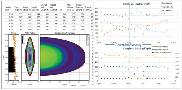 The high-viscosity, high-conductivity treatment design was expected to provide more uniform proppant placement with less sensitivity to landing zone depth. The modeling results showed that the treatment schedules did not vary greatly with landing point depths throughout the Chambliss and Brahaney intervals.
