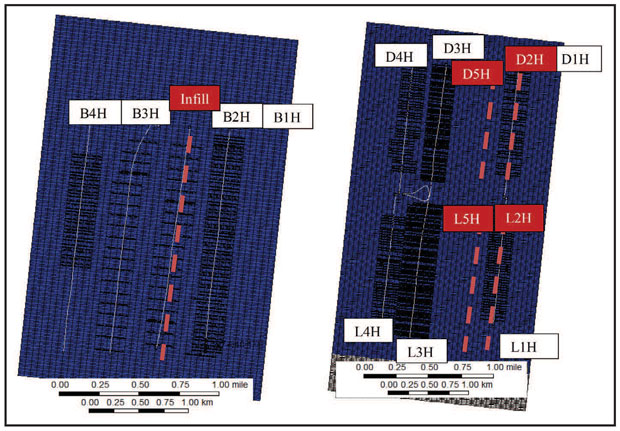 Three cases were used in the eastern modeling sensitivity runs. Case 1 had one infill well in each section (D5H and L2H) at a well spacing of four wells per section. Case 2 drilled two additional infill wells (D2H and L5H) with a deeper landing zone for the L5H (top of the Brahaney). Case 3 also had four total infills, but with a shallower landing zone for the L5H (Lower Chambliss) and a different fracture geometry. The modeling results for cases 2 and 3 were almost identical. Both increased field-level cumulative oil recovery by an incremental 200,000 barrels.