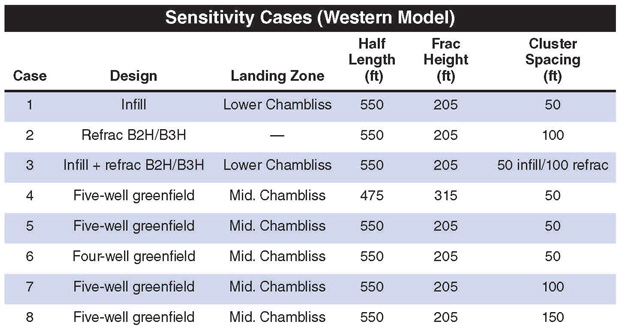 The two history-matched models were set up to test different development scenarios. The eastern model was designed to test well spacing and landing zones, while the western model was used to compare infill drilling and refrac operations. A greenfield development plan also was examined in the western model.