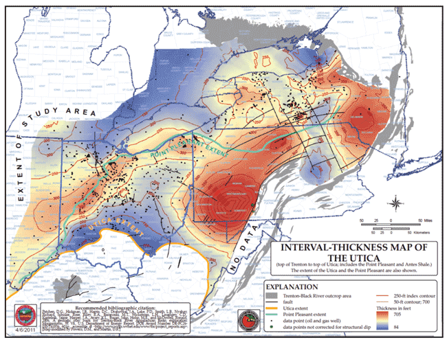 But lurking 2,000 to 7,000 feet beneath the massive Marcellus formation is an even more dominant geologic feature: the Utica Shale, an Ordovician-age formation that is thicker and much more geographically expansive than even the Marcellus.