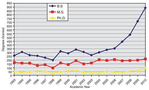 To meet the projected needs for petroleum engineers, universities around the world have increased enrollment in their petroleum engineering programs. For example, the number of bachelor degrees awarded by U.S. universities has nearly tripled in the past four years (Figure 1).