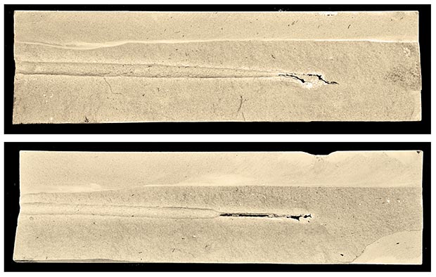 GEODynamics reports that perforating charges with its reactive technology (top), which generates heat and mechanical energy after the perforation event, create longer and clearer tunnels than conventional charges (bottom).