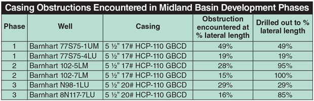 A combination of mitigation strategies and operational awareness resulted in more preferable outcomes in phases two and three, as shown in Table 1. Obstructions were passed and the laterals were drilled out to an economically acceptable depth on three of the four wells with casing obstructions (the fourth well is still under evaluation).