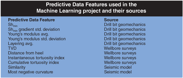 Machine learning requires two categories of features: predictive data features and supervising data features. The predictive data features for the models used in this study came from wellbore surveys, drill bit geomechanics and seismic data (Table 2). The geomechanical data was acquired by a sensor containing an accelerometer and gyro to capture data in three directions (lateral, axial and tangential) at high frequencies. Once a well was drilled, the acceleration data was processed for both isotropic and anisotropic rock properties. Because these measurements were collected at very high resolution, both the average value of the measurement and the standard deviation of the measurement along a stage were included in the models.