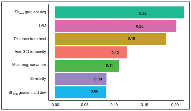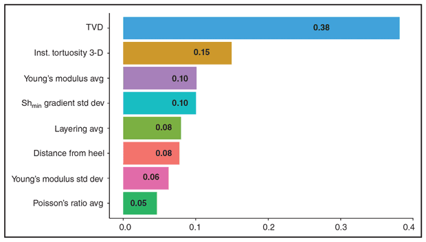 The end-of-stage fracture gradient regression model delivered acceptable predictions when compared with actual results. The RMSE of the model was 0.064 psi/foot (mean RMSE of 0.074 psi/foot). The model ranked the importance of the data features from most to least important as average Shmin gradient, TVD, distance from the heel, cumulative 3-D tortuosity, most negative curvature, similarity, and the standard deviation of Shmin gradient over the stage length (Figure 1).