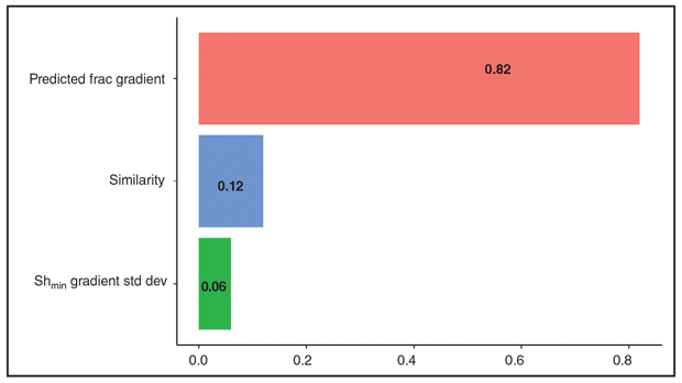 The high fracture gradient classification model received an AUC score of 0.91 and made very few false positive predictions. Because the model was right in predicting high fracture gradient stages, but did not predict all instances of high fracture gradient stages, it had high precision but low recall. The low recall was deemed acceptable since it was believed that some features that caused high fracture gradients (cement quality, plug performance, etc.) were not captured in the predictive data. The model ranked features in descending order of importance as predicted frac gradient from deterministic model, similarity, and Shmin gradient (Figure 2).