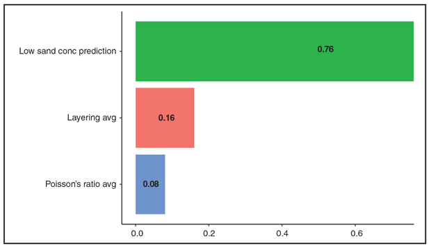 The initial classification model for low sand concentration had an AUC score of 0.84. It ranked the features from most to least important as TVD, instantaneous 3-D tortuosity, average Young’s modulus, standard deviation of Shmin gradient, average layering, distance from the heel, standard deviation of Young’s modulus, and average Shmin gradient (Figure 3). The model for delivering a probabilistic result for low sand concentration had a slightly lower AUC score of 0.75 and a lower false positive rate. It ranked the features in descending order as initial model prediction, average layering and average Shmin gradient (Figure 4).