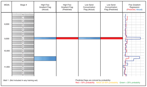 All four models successfully predicted their proxies for casing deformation stages, but could they predict casing deformation? One of the four stages with both casing deformation and a full set of data was not included in the training dataset (stage 67 in Figure 5). The probabilistic fracture gradient model and both low sand concentration models predicted proxies at that stage. While this sample size was too small to give statistically significant results, it was encouraging that the proxies predicted the one instance of casing collapse not in the training set. The final models also correctly predicted both high fracture gradients and low sand concentrations for the casing deformation stages included in the data.