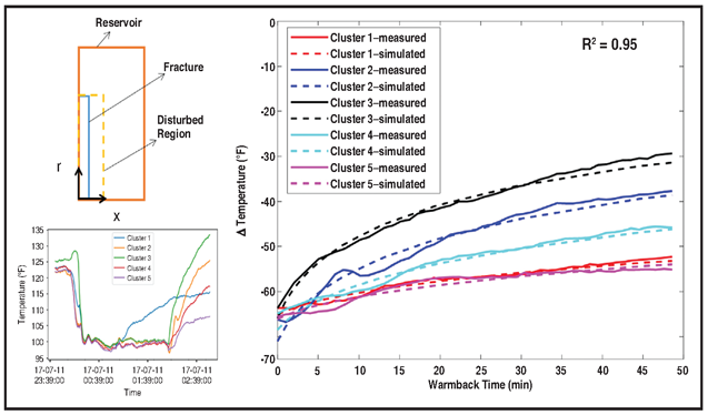 Figure 2 shows the actual-versus-modeled thermal changes in the wellbore when warm-back began (warm-back time was adjusted to zero once a cluster shut down). From the different slopes in the warm-back signatures, it is possible to estimate the contribution of fluid across individual clusters. A high degree of correlation is evident between warm-back time and difference in temperature when comparing simulated versus measured temperatures in each of the clusters utilizing the thermal modeling approach.