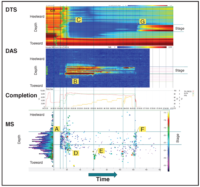 For this stage, DAS indicated good transmission of energy (point A) across the perforation starts at point B as the stage came up to rate, with the cooling of the fiber shortly afterward (point C). One key aspect is that the microseismic occurred early across most of the perforated interval and developed outward in a slightly toe-ward direction through time (D). Minor variations in surface pressure, DAS and microseismic are noted at point E. At the end of the stage during shutdown, pressure was abruptly lowered and an increase in microseismic events along the main perforation interval was observed (F). Thermal warming began shortly thereafter (G). The noted increase in microseismic activity as the pumps shut down suggested that we may have been imaging the closing down of fracture aperture.