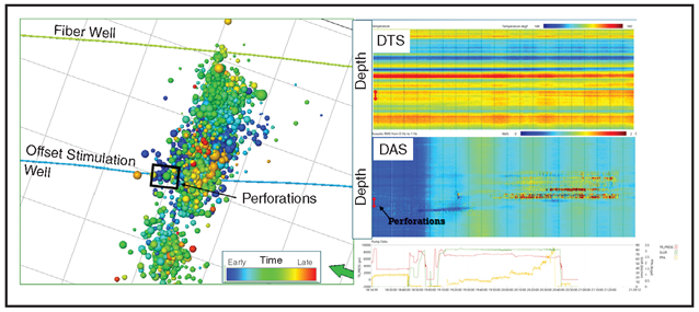 IRVING, TX.–Integrating fiber optics-based distributed acoustic sensing (DAS) and distributed temperature sensing (DTS) with microseismic and downhole pressure data provides critical insights into the physical processes taking place in the near- and far-field wellbore environment during hydraulic fracturing. Visualizing these integrated data both three dimensionally and temporally leads to an improved understanding of how the reservoir responds to stimulation, highlights processes relevant to optimizing completion designs, and enables better interpretation of each type of data.