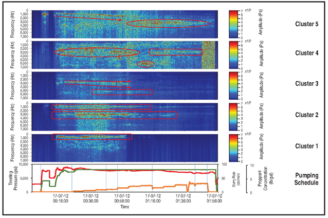 Figure 5 shows the frequency analysis across five clusters and their temporal changes in energy through time that could be related to changes in fluid. Once DTS and DAS fluid allocations at the cluster level were obtained, the two techniques were compared and related to downhole dynamics to better understand stage-to-stage uniformity. Some of the noted variations are highlighted in the red boxes (in this example, the DAS data terminated early, as shown for Cluster 4).