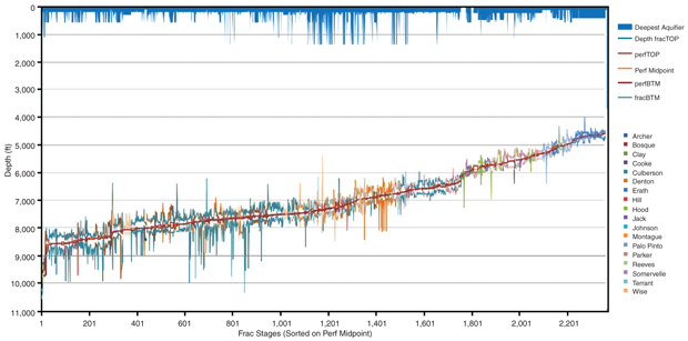 Almost 400 separate frac stages are shown, color coded by state. As can be seen, the fractures do grow upward quite a bit taller than in the Barnett, but the shallowest fracture tops are still ±4,500 feet, almost one mile below the surface and thousands of feet below the aquifers in those counties.